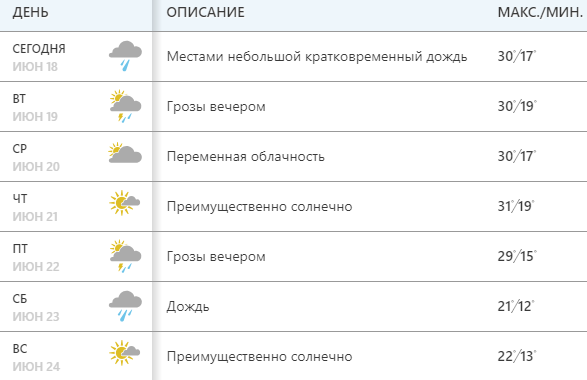Сайт Weather.com сообщает, что дождь ожидается в понедельник, вторник, пятницу и субботу. Неделя начнется с жары до +29...+30. На выходных +21...+22.