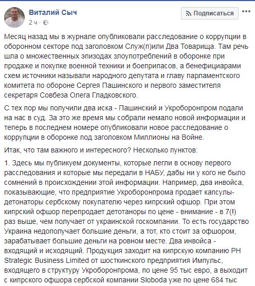 "При этом кипрский офшор перепродает детотаноры по цене - внимание - в 7(!) раз выше, чем получает от украинской госкомпании. То есть государство Украина недополучает большие деньги, а тот, кто стоит за офшором, зарабатывает большие деньги на ровном месте. Два инвойса - входящий и исходящий. Продукция заходит на кипрскую компанию PH Strategic Business Limited от шосткинского предприятия Импульс, входящего в структуру Укроборонпрома, по цене 95 тыс евро, а выходит с кипрского офшора сербской компании Sloboda уже по цене 684 тыс евро. Неплохой бизнес, не правда ли? И там же другие документы по тому расследованию", - заявил Сыч.