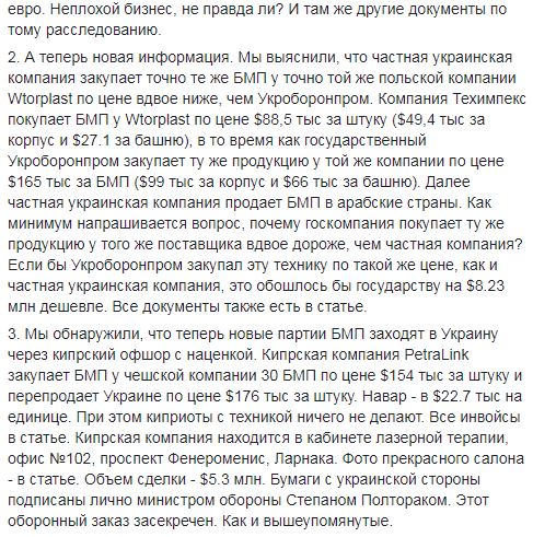 "Компания Техимпекс покупает БМП у Wtorplast по цене $88,5 тыс за штуку ($49,4 тыс за корпус и $27.1 за башню), в то время как государственный Укроборонпром закупает ту же продукцию у той же компании по цене $165 тыс за БМП ($99 тыс за корпус и $66 тыс за башню). Далее частная украинская компания продает БМП в арабские страны. Как минимум напрашивается вопрос, почему госкомпания покупает ту же продукцию у того же поставщика вдвое дороже, чем частная компания? Если бы Укроборонпром закупал эту технику по такой же цене, как и частная украинская компания, это обошлось бы государству на $8.23 млн дешевле. Все документы также есть в статье", - добавил главред "Нового времени".