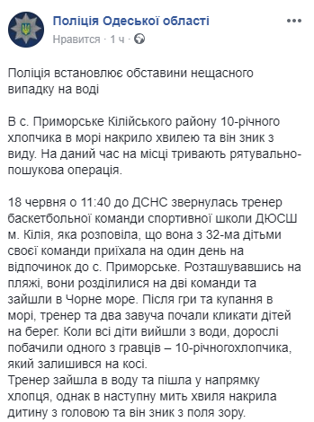 Сегодня в ГосЧС обратилась тренер баскетбольной команды спортивной школы ДЮСШ г. Килия, которая рассказала, что она с 32-ю детьми своей команды приехала на один день на отдых в с. Приморское. Расположившись на пляже, они разделились на две команды и зашли в Черное море. После игры и купания в море, тренер и два завуча начали звать детей на берег. Когда все дети вышли из воды, взрослые увидели одного из игроков - 10-летнего мальчика, который остался на косе.