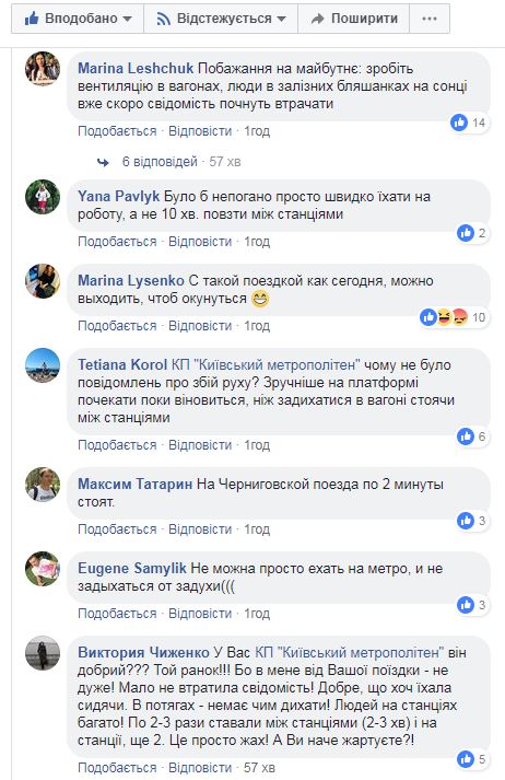 А вот в соцсетях пользователи рассказывают о пережитом утре. "Почему не было сообщений о сбое движения? Удобнее на платформе подождать пока возобновится движение, чем задыхаться в вагоне стоя между станциями", - пишет Татьяна Король в Facebook.