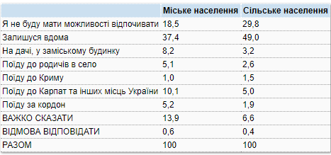 Большие разногласия относительно планов на отдых среди жителей сел и городов. Так, 79% жителей сел не планируют никуда ехать, лишь 3% планируют поездку на дачу.