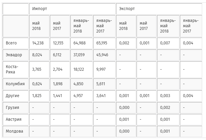 В январе-мае текущего года по сравнению с аналогичным периодом 2017 года импорт бананов уменьшился на 0,3%, или на 0,207 млн долларов до 64,988 млн долларов. В то же время экспорт увеличился на 75%, или на 0,003 млн долларов до 0,007 млн долларов.