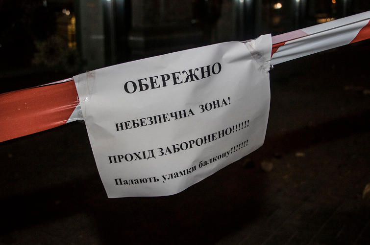 Инцидент произошел около 21:00 в доме №29. Обрушилась лепнина фасада. Куски бетона с четвертого этажа посыпались на тротуар и проезжую часть между магазином Roshen и вареничной "Катюша".