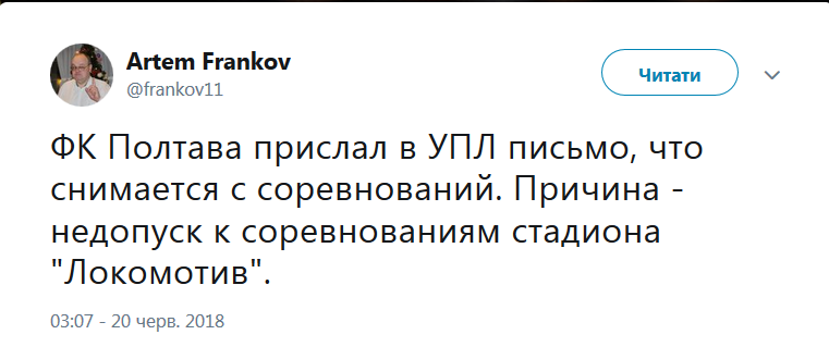 "ФК "Полтава" прислал в УПЛ письмо, что снимается с соревнований. Причина - недопуск к соревнованиям стадиона "Локомотив", - написал Артем Франков.