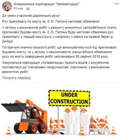 "Вниманию участников дорожного движения! Движение транспорта по мосту им. Е.А. Патона частично ограничено!", - говорится в сообщении.