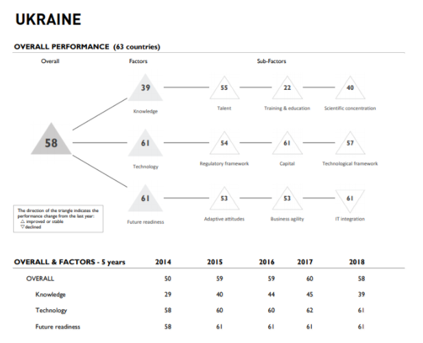 Согласно отчёту, за год Украина продемонстрировала улучшения в знаниях и перешла с 45 на 39 место, а также технологиях, поднявшись на ступеньку с 62 на 61 место. Показатели "Готовность к будущему" остались прежними.