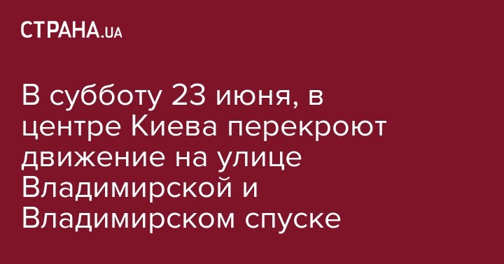"В столице 23 июня с 19:30 до 21:30 будет запрещено движение всех видов транспорта вдоль Владимирского проезда (от перекрестка с ул. Владимирская до перекрестка с ул. Малой Житомирской) и на ул. Владимирской (от перекрестка с ул. Рейтарской до перекрестка с ул. Большой Житомирской)", - говорится в сообщении.