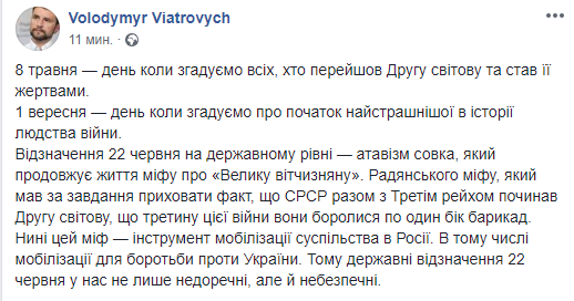 "Празднование 22 июня на государственном уровне – атавизм совка, который продлевает жизнь мифа о "Великой отечественной". Советского мифа, который имел задачу скрыть факт, что СССР вместе с Третьим рейхом начинал Вторую мировую, что треть этой войны они сражались по одну сторону баррикад. Сейчас этот миф – инструмент мобилизации общества в России. В том числе мобилизации для борьбы против Украины. Поэтому государственные отмечания 22 июня у нас не только неуместны, но и опасны", – написал Вятрович сегодня в Facebook.
