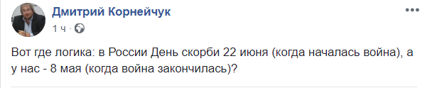 "Вот где логика: в России День скорби 22 июня (когда началась война), а у нас – 8 мая (когда война закончилась)?"
