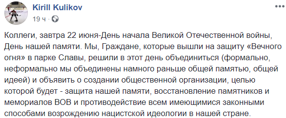 "Коллеги, завтра 22 июня – День начала Великой Отечественной войны, День нашей памяти. Мы, Граждане, которые вышли на защиту "Вечного огня" в парке Славы, решили в этот день объединиться (формально, неформально мы объединены намного раньше общей памятью, общей идеей) и объявить о создании общественной организации, целью которой будет защита нашей памяти, восстановление памятников и мемориалов ВОВ и противодействие всеми имеющимися законными способами возрождению нацистской идеологии в нашей стране", – пишет активист Кирилл Куликов.