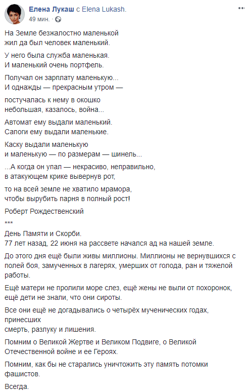 "77 лет назад 22 июня на рассвете начался ад на нашей земле.