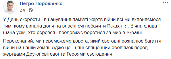 Убежден, мы победим врага, который сегодня разжигает костер войны на нашей земле. Ведь это – наш священный долг перед жертвами Второй мировой и Героями сегодняшнего дня", – написал президент.