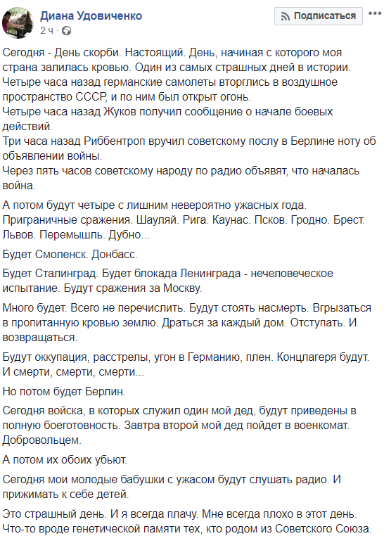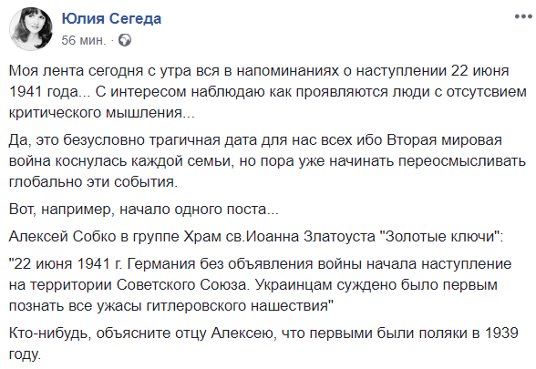 "Моя лента сегодня с утра вся в напоминаниях о наступлении 22 июня 1941 года... С интересом наблюдаю, как проявляются люди с отсутствием критического мышления...