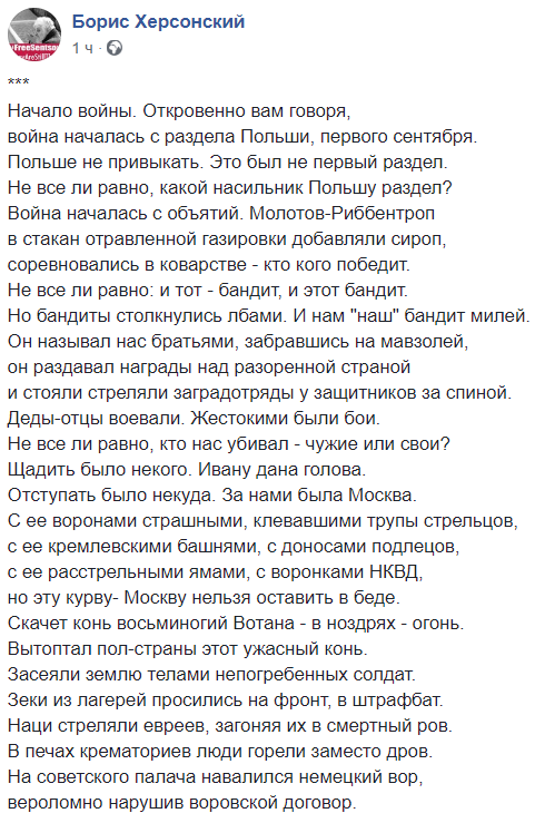 Украинский поэт Борис Херсонский придерживается примерно той же позиции, считая "бандитами" и немцев, и Советский Союз. Он даже сегодня написал стихотворение на этот счет: