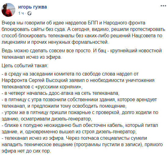 "Вчера мы говорили об идее нардепов БПП и Народного фронта блокировать сайты без суда. А сегодня, видимо, решили протестировать способ блокировать телеканалы без каких-либо решений Нацсовета по лицензиям и прочих ненужных формальностей.