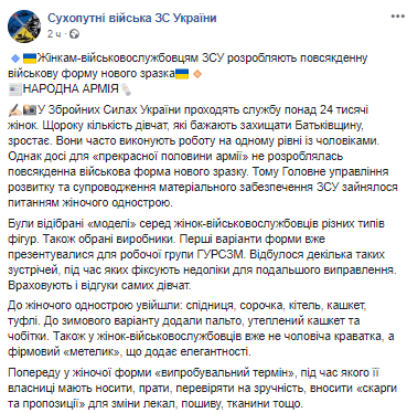 Как сообщают в Сухопутных войсках ВСУ, в армии служат свыше 24 тысяч женщин, однако до последнего времени у них не было повседневной формы нового образца. Именно поэтому в Главном управлении развития и сопровождения материального обеспечения ВСУ занялось вопросом женской униформы.