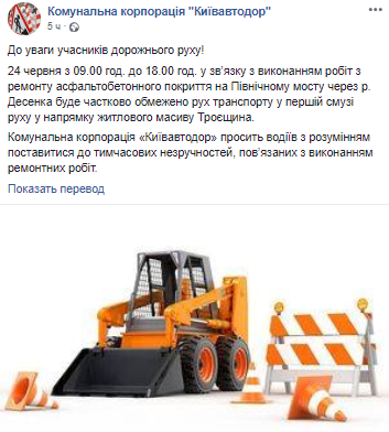 В Киеве в воскресенье, 24 июня, на Северном мосту через речку Десенка частично ограничат движение транспорта. Это связано с выполнением работ по ремонту асфальтобетонного покрытия, сообщает Киевавтодор на своей странице в соцсети.