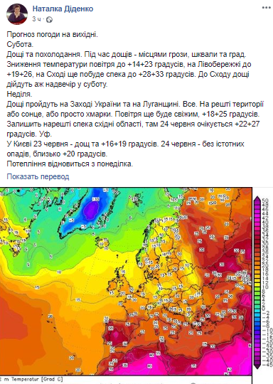 "Дожди и похолодание. Во время дождей - местами грозы, шквалы и град. Снижение температуры воздуха до + 14 + 23 градусов, на Левобережье до + 19 + 26, на Востоке еще побудет жара до + 28 + 33 градусов. К Востоку дожди придут только к вечеру в субботу", - предупредила Диденко.