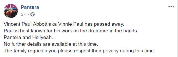 "Винсент Пол Эбботт, известный как Винни Пол, скончался", — говорится в заявлении группы. Члены семьи попросили отнестись с уважением к их частной жизни в связи с кончиной Пола.