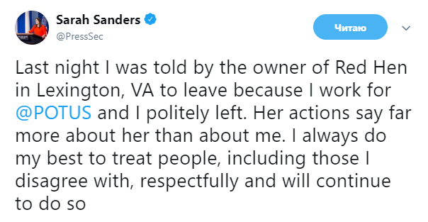 "Вчера вечером хозяйка ресторана Red Hen в Лексингтоне (штат Вирджиния) попросила меня уйти, потому что я работаю на Трампа, и я вежливо ушла. Ее действия больше говорят о ней, чем обо мне", - написала Сандерс в субботу 23 июня в своем микроблоге в Twitter.