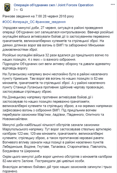 В сообщении говорится о том, что российские оккупационные войска 32 раза применяли прицельный огонь по нашим позициям. Причем четыре раза - из тяжелого вооружения.