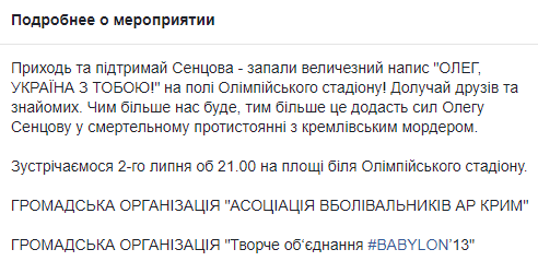 "Приходи и поддержи Сенцова - зажги огромную надпись "Олег, Украина с тобой!" на поле Олимпийского стадиона! Приобщают друзей и знакомых. Чем больше нас будет, тем больше это придаст сил Олегу Сенцов в смертельном противостоянии с кремлевским мордером", - сказано в сообщении.