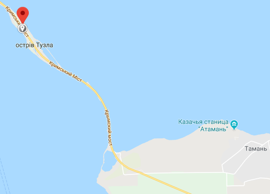 Топоним подписан со стороны Таманского полуострова на русском, а ближе к полуострову надпись гласит "Кримський Мiст".