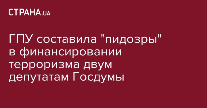 В Генеральной прокуратуре Украины составлены сообщения о подозрении двум депутатам Государственной Думы Российской Федерации в совершении ими преступления, предусмотренного ч. 3 ст. 258-5 УК Украины (финансирование терроризма), сообщает пресс-служба ведомства.