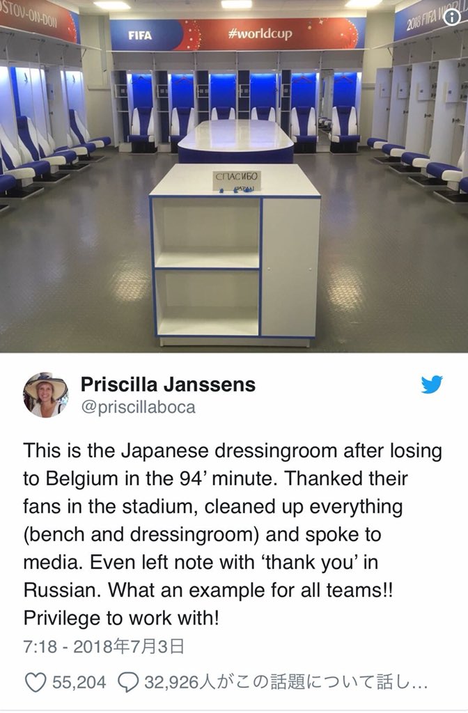 После такого поражения японские футболисты остались на поле, чтобы поблагодарить своих болельщиков за поддержку. Также игроки навели порядок на скамейке запасных и в своей раздевалке, оставив записку на русском языке с надписью "Спасибо", отметила она.