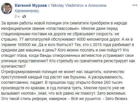 "За время работы новой полиции эти симпатяги приобрели в народе неофициальное звание "пластмассовые". Многие даже перед стационарными постами на дороге не сбрасывают скорость – не страшно. 77 автопатрулей обслуживают 4000 километров дорог. А их в Украине 169 500 км. Да и кого бояться? Тех, кто с 2015 года разбивает в среднем две машины в день? Кого можно послать – и они пойдут? Кто отводит глаза, когда банды отмороженных активистов устраивают свои уличные представления? Кто стрельбу из гранатомета регистрирует как хулиганство?