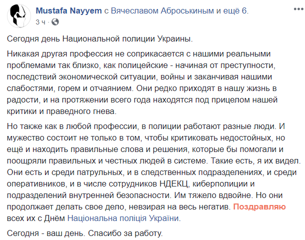 Но так же, как в любой профессии, в полиции работают разные люди. И мужество состоит не только в том, чтобы критиковать недостойных, но еще и находить правильные слова и решения, которые бы помогали и поощряли правильных и честных людей в системе. Такие есть, я их видел. Они есть и среди патрульных, и в следственных подразделениях, и среди оперативников, и в числе сотрудников НДЕКЦ, киберполиции и подразделений внутренней безопасности. Им тяжело вдвойне. Но они продолжает делать свое дело, невзирая на весь негатив".