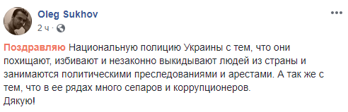 "Поздравляю Национальную полицию Украины с тем, что они похищают, избивают и незаконно выкидывают людей из страны и занимаются политическими преследованиями и арестами. А также с тем, что в ее рядах много сепаров и коррупционеров.
