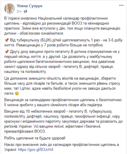 Кроме того, на странице Супрун разместила ссылки на приказ о внесении изменений в календарь профилактических прививок в Украине и сам обновленный календарь.