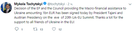 "Решение ЕП и Совета о предоставлении макрофинансовой помощи Украине в размере 1 млрд евро было подписано сегодня президентом Таяни и Австрийским президентством накануне 20-го саммита Украина-ЕС. Очень благодарен за поддержку всем друзьям Украины в ЕС!" - написал Точицкий в Twitter.