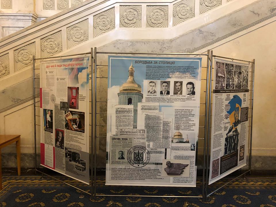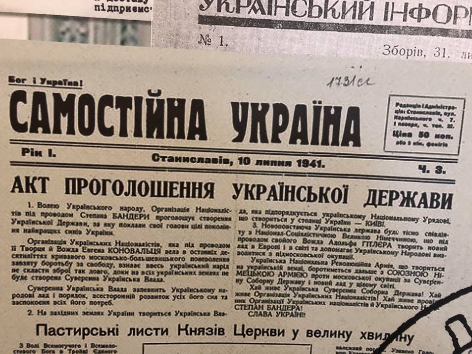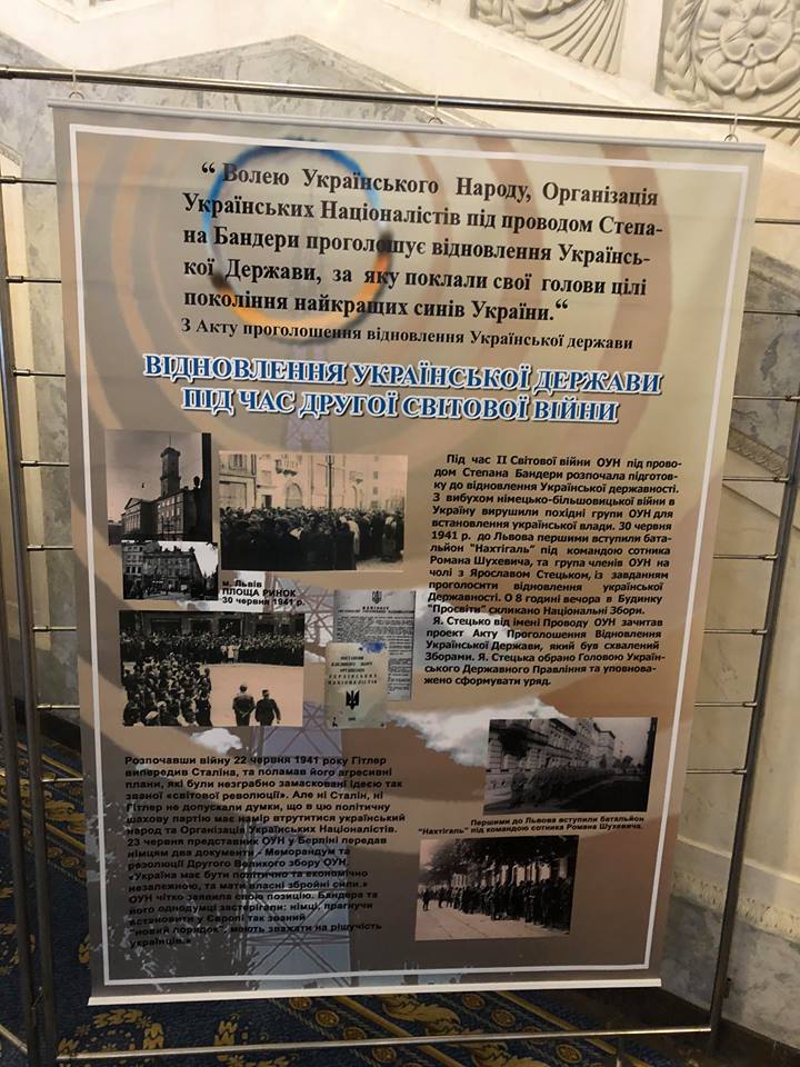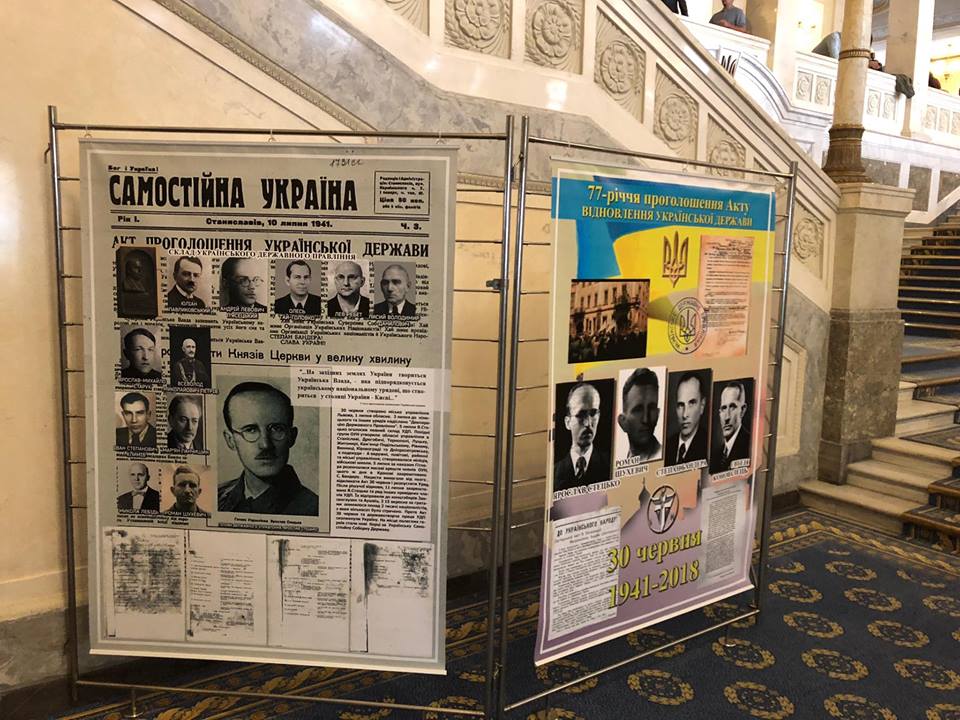Экспозиция называется "Восстановление украинской государственности во время Второй Мировой войны" и посвящена 77-летию провозглашения Акта восстановления украинского государства 30 июня 1941 года. Его объявили сторонники бандеровского крыла в ОУН. Будущее украинское государство ими виделось как союзник нацистской Германии. О чем, собственно, прямо написано в самом Акте: