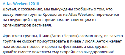"Друзья, к сожалению, мы вынуждены сообщить о том, что выступление группы Кровосток на Atlas Weekend переносится на следующий год по причинам, не зависящим от организаторов фестиваля", - сообщается на странице фестиваля в Facebook.