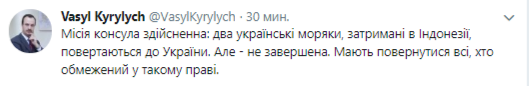 "Миссия консула выполнима: два украинских моряка, задержанных в Индонезии, возвращаются в Украину. Но не завершена. Должны вернуться все, кто ограничен в таком праве", - написал он на своей странице в микроблоге twitter в пятницу.