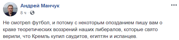 Журналист Андрей Манчук пишет "о крахе теоретических воззрений наших либералов, которые свято верили, что Кремль купил саудитов, египтян и испанцев".