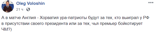 "А в матче Англия - Хорватия ура-патриоты будут за тех, кто выиграл у РФ в присутствии своего президента или за тех, чья премьер бойкотирует ЧМ?" - задается вопросом политолог Олег Волошин.