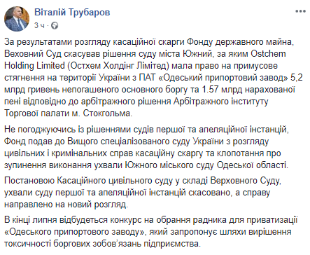 Верховный Суд отменил решение суда Южного, согласно которому Ostchem Holding Limited Дмитрия Фирташа имела право на взыскание с ПАО "Одесский припортовый завод" 5,2 миллиарда гривен непогашенного основного долга и 1,57 миллиарда пени в соответствии с арбитражным решением Арбитражного института Торговой палаты Стокгольма.