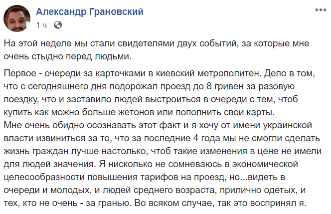 Мне очень обидно осознавать этот факт и я хочу от имени украинской власти извиниться за то, что за последние 4 года мы не смогли сделать жизнь граждан лучше настолько, чтоб такие изменения в цене не имели для людей значения. Я нисколько не сомневаюсь в экономической целесообразности повышения тарифов на проезд, но...видеть в очереди и молодых, и людей среднего возраста, прилично одетых, и тех, кто не очень - за гранью. Во всяком случае, так это воспринял я", - пишет нардеп Александр Грановский.