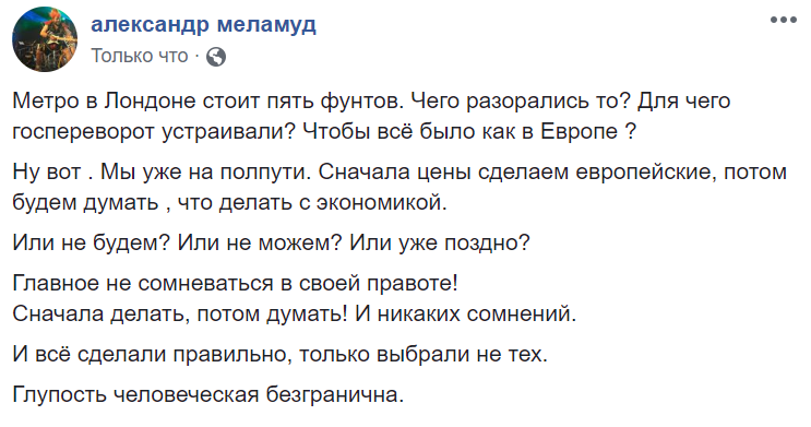 "Метро в Лондоне стоит пять фунтов. Чего разорались то? Для чего госпереворот устраивали? Чтобы всё было как в Европе ?