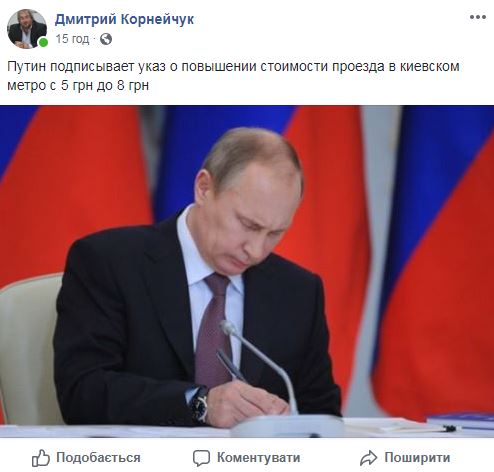 "Путин подписывает указ о повышении стоимости проезда в киевском метро с 5 грн до 8 грн", - традиционный троллинг от политолога Дмитрия Корнейчука.