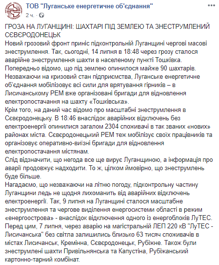 В субботу 14 июля из-за аварийного обесточивания шахты во время грозы в населенном пункте Тошковка на Луганщине под землей оказалось почти 90 шахтеров.