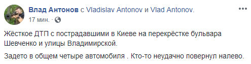 "Жесткое ДТП с пострадавшими в Киеве на перекрестке бульвара Шевченко и улицы Владимирской. Задето в общем четыре автомобиля. Кто-то неудачно повернул налево", - сказано в сообщении.