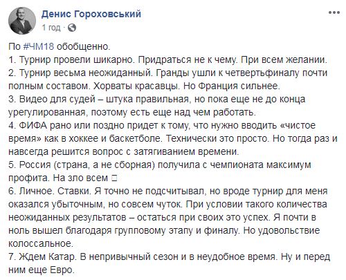 "Турнир провели шикарно. Придраться не к чему. При всем желании", - пишет Денис Гороховский, расписав обо всех нюансах, которые ему запомнились во время ЧМ-2018.