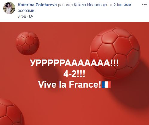 "Отличная! Очень и очень достойный финал. Зрелищный, голевой, просто офигенный! Обе команды показали футбол самого лучшего качества. Кайфанула", - написала блогер Екатерина Золотарева.
