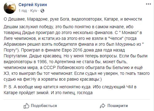 "Если бы были видеоповторы в 1986, то Аргентина не стала бы, может быть, чемпионом мира, а СССР Лобановского обыграла бы Бельгию и ещё ХЗ, кто выиграл бы тот чемпионат. Если судья не уверен, то гнать такого судью на фиг. Ну а хорваты все равно красавцы:)" , - рассуждает Сергей Кузин.