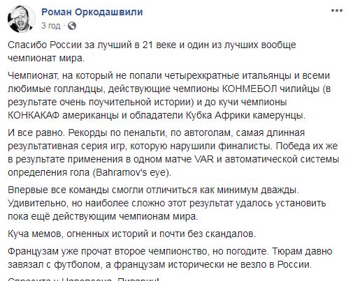 Куча мемов, огненных историй и почти без скандалов Французам уже прочат второе чемпионство, но погодите. Тюрам давно завязал с футболом, а французам исторически не везло в России.Спросите у Наполеона. Пиварич!", - резюмировал Оркодашвили.